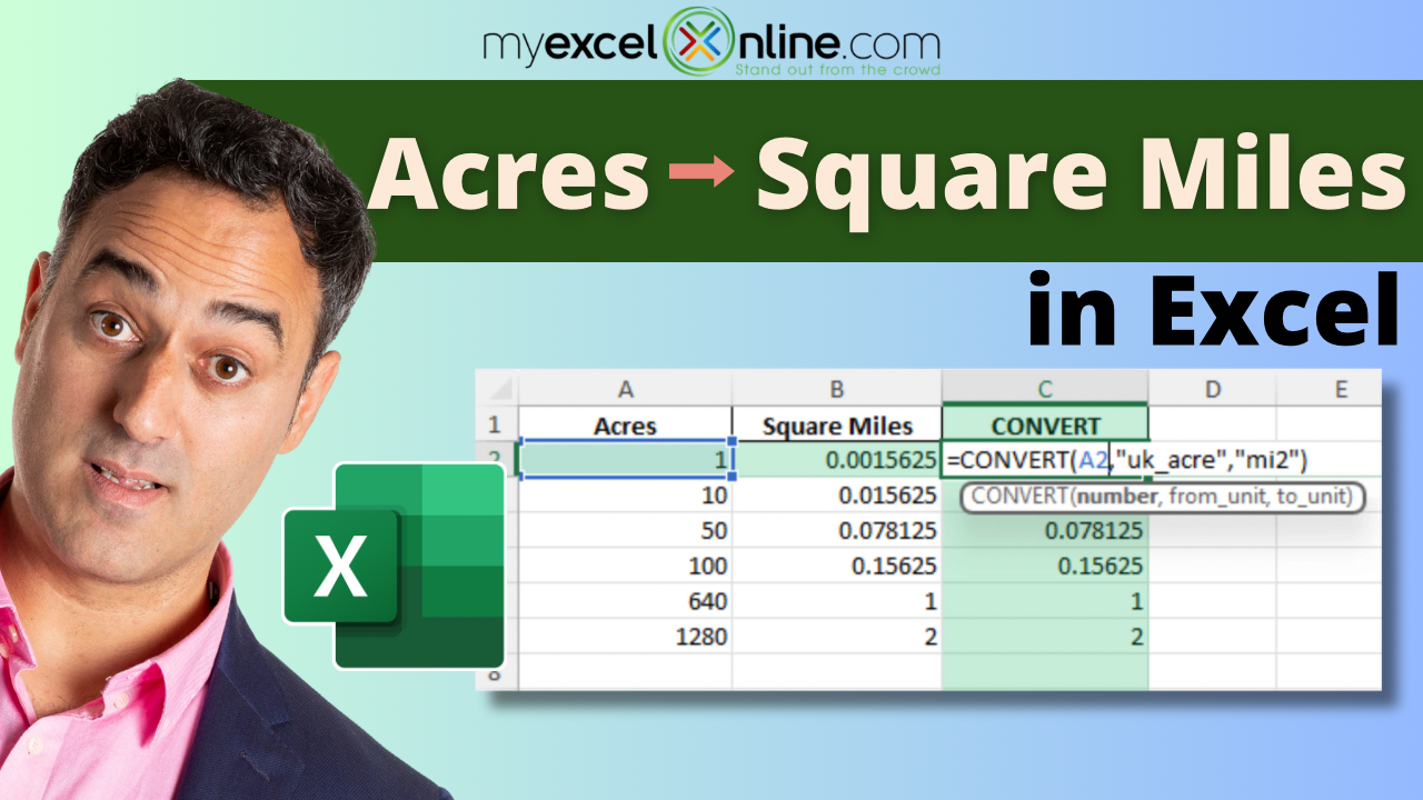 Ya, gunakan =CONVERT(A2,"ac","mi2") untuk konversi langsung.